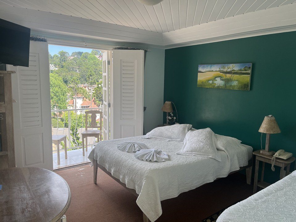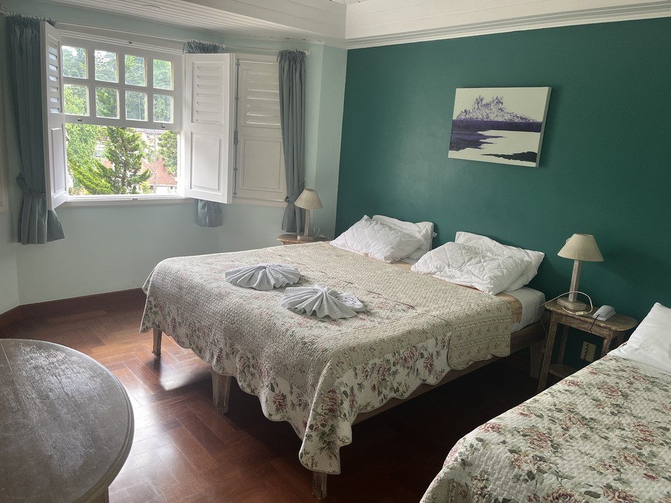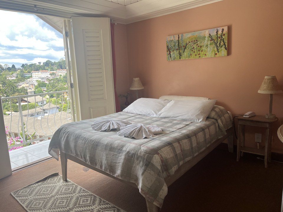 Apartamento Standard Bay-Window, fica na parte térrea dos blocos com piso de madeira, cama King e solteiro, aquecedor à óleo, frigobar, tv smart32", interfone, e secador de cabelo.