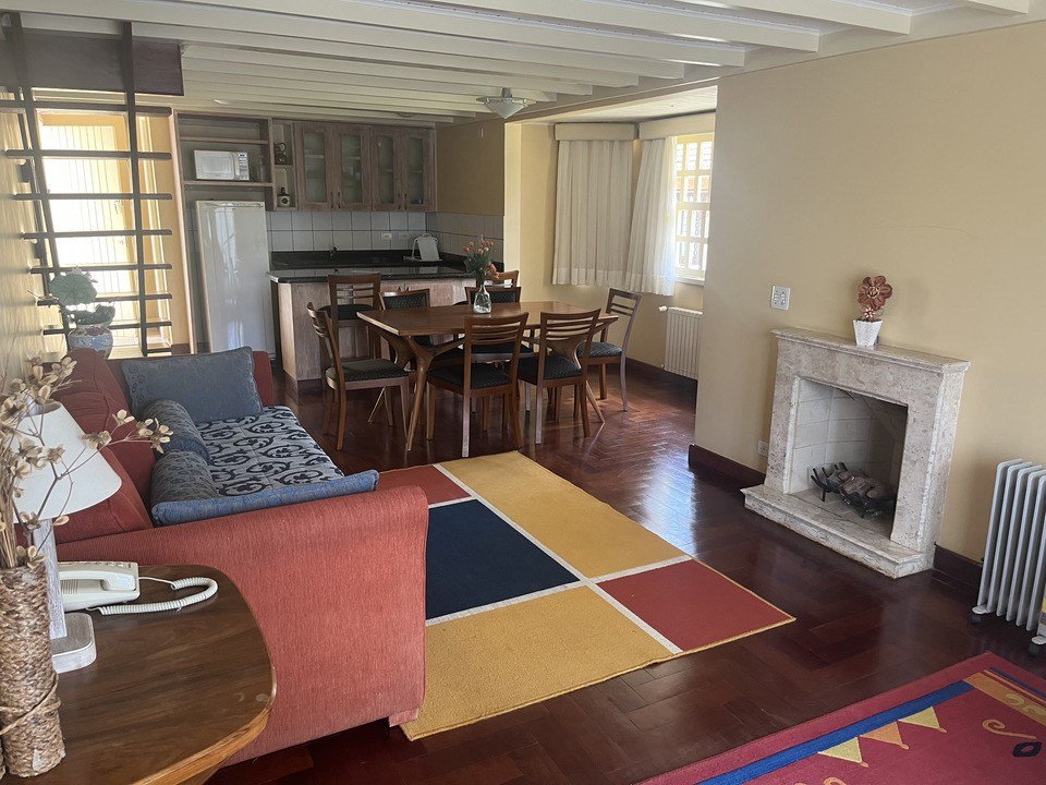 Suíte Loft, sala com lareira a gás, cozinha estilo americano, mezanino, aquecimento por calefação, chuveiro à gas, geladeira, micro-ondas, tv Smart, interfone e secador de cabelo.